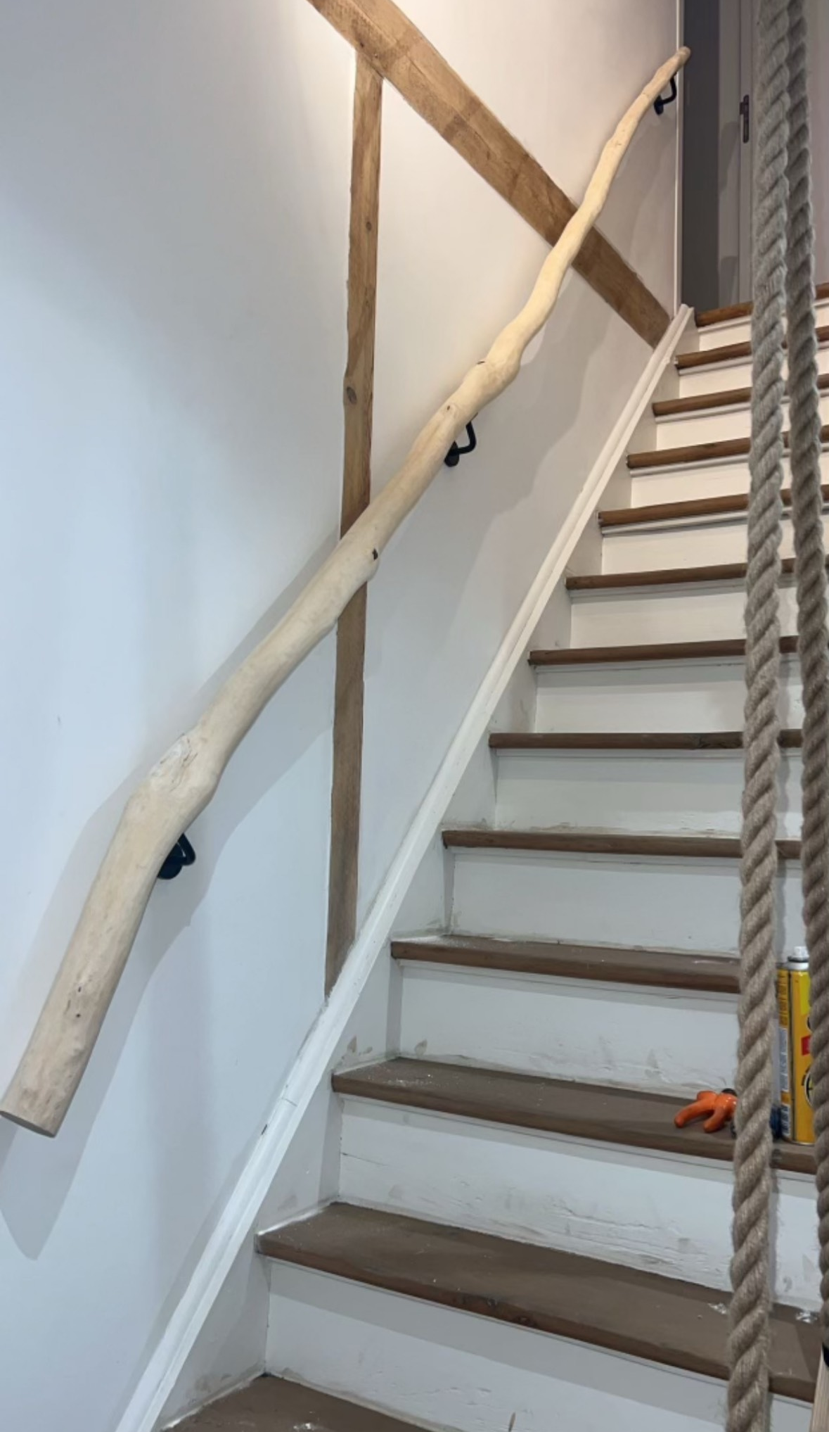 Branche de bouleau écorcée, traitée et poncée à usage de rampe d’escalier.